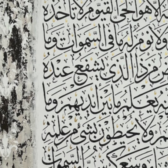 Original abstract calligraphy fine Art including Quran Verses of Ayat alkursi written by black color. Using high quality of canvas and color.